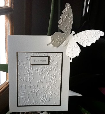 Both of the cards where made using the Silhouette including the background paper . For the flower I used my Paper Artsy flower die and the two little butterflies on the lower card which I hand punched ( not a rubber stamp or a drop of ink in sight ) the butterflies where added purely to cover up a little accident I had with my glue gun , ah whats a girl to do. Now for all you stampers and inkers out there who are most probably thinking this took me about two minutes I have to say in my defense that using electric die cutters is not as easy as it seems ! It has taken me hours to produce these two and then of course I lost the light ! Would also like to enter this into Moving along with the Times challenge a blog that I have been keeping an eye on of late, lot’s of my followers seem to enter this one so I thought well why should I be left out !!! Their theme is ” Here Comes Summer ” and I hope these cards fit the bill. http://movingalongwiththetimes.blogspot.com/