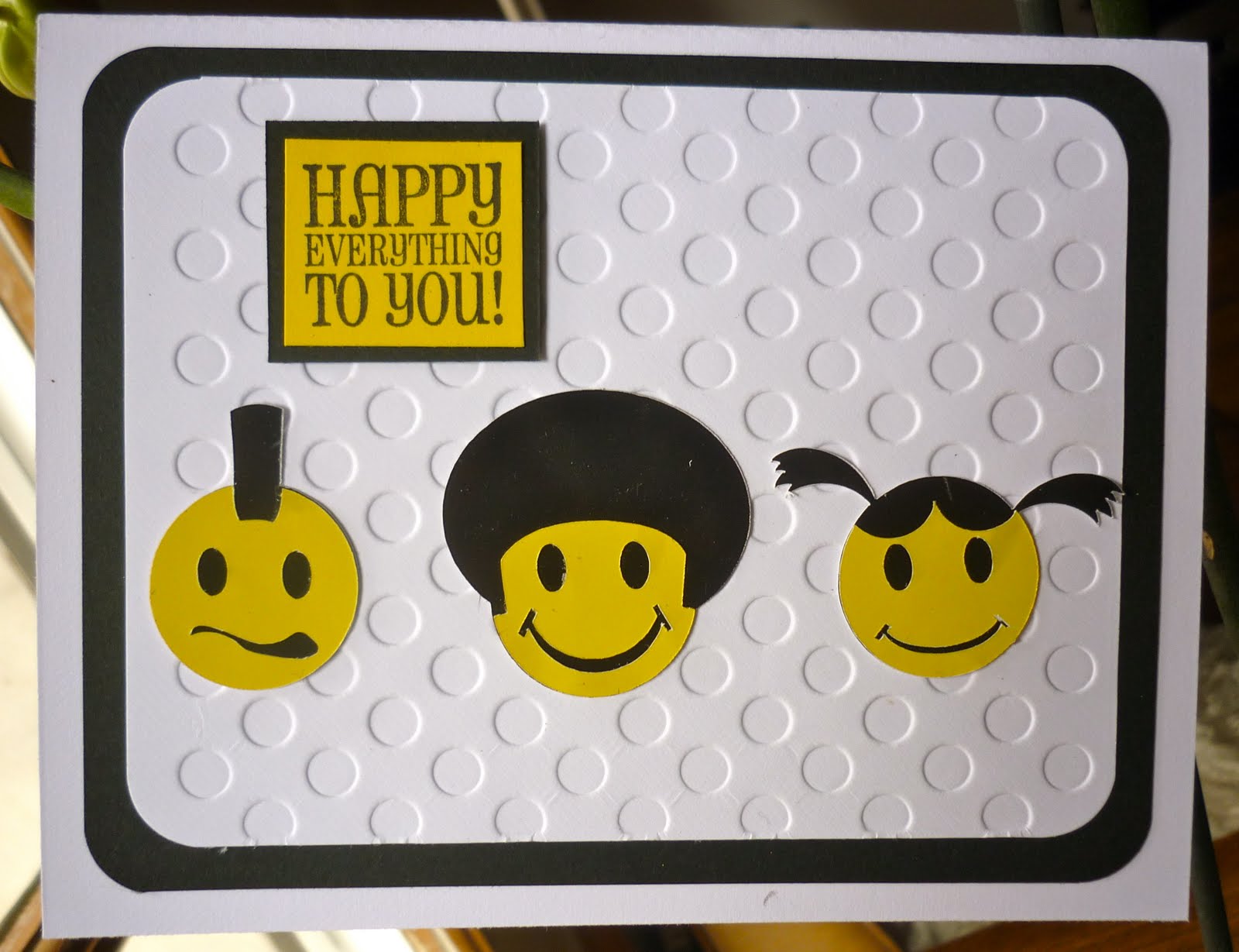 As you can see kept it simple using my Silhouette to make the smiley faces ( boy how I disliked these annoying cheery faces when I was young ) The sentiment is Stampin Up and Ranger distress ink, ran the card through the Big Shot for a little texture and then matted onto black card.