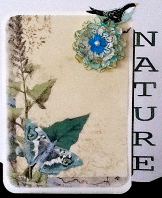 For this first one I used Designer Digitals paper which I printed onto parchment and added some little green pearls on the butterflies wings , although you do need a magnifying glass and a spotlight to see them ! I used my Silhouette to cut out anther piece of paper with the word nature incorporated. I made my flower using more parchment paper which I then embossed and coloured with Distress Inks a little bling in the centre and a pearl.