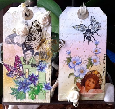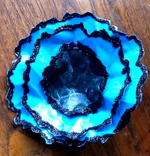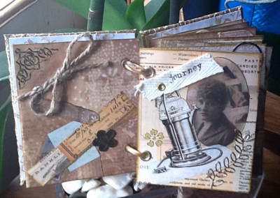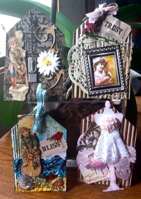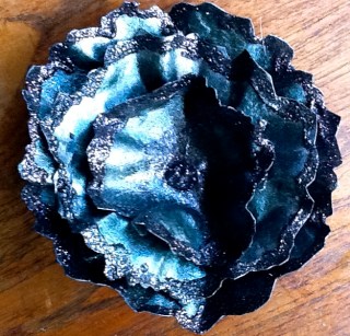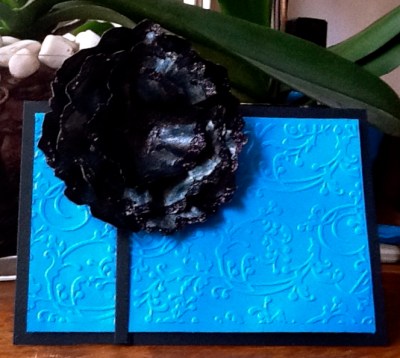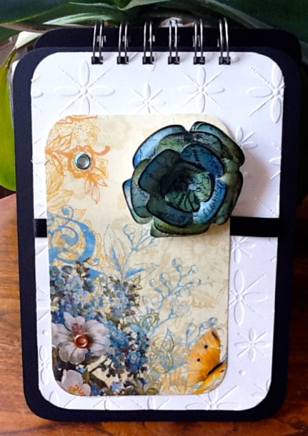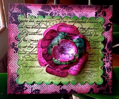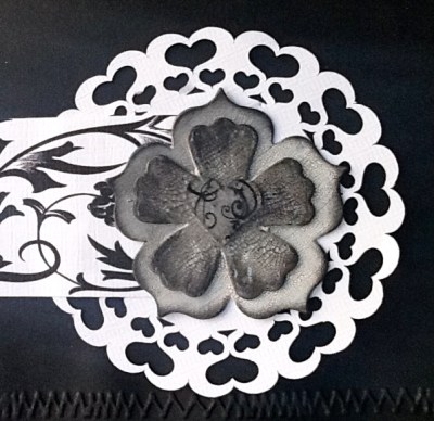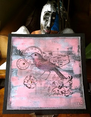 Black white, silver and pink ! Black base, white Gesso, white crackle paint, silver ink over the crackle paint and around the edges black pearls on the bids eye and black embossed bird image and rubbish photo . I usually like to post three pieces for each challenge and I do in fact have several other pieces that I did but I just don’t like them !