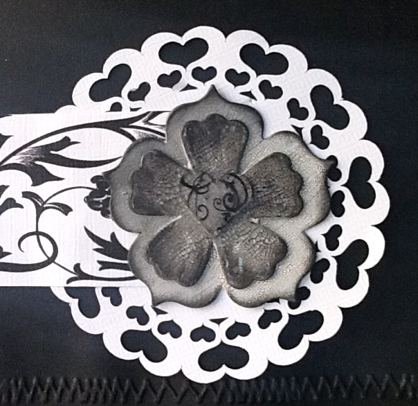 Hero Arts swirly image, Silhouette doily , stampin up flower with crackle paint and a little heart from shrink plastic.
