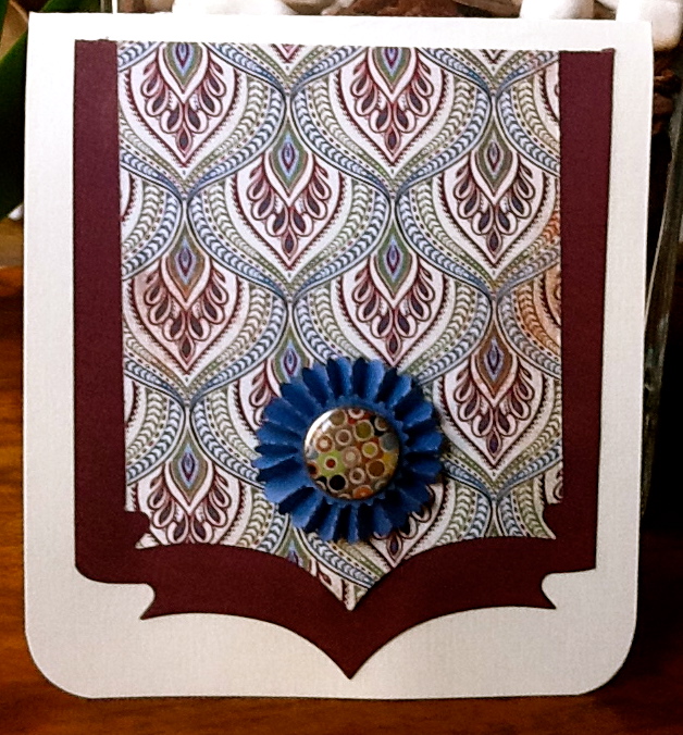 Here I  made a simple card using one of my Spellbinders nested die sets to cut the base card and the two layers of felt. The base and the larger felt layer I embossed with SU script embossing folder.The top layer of felt I double embossed. Using one of my favorite embossing Sizzix embossing folders and using my Brayer rolled ink onto the inside of one half of the folder placed the felt carefully inside and then passed it through the big shot. As you can see the ink has adhered only to the raised part of the design. One tip here if using felt ensure that you choose a light color and a dark ink for best results.