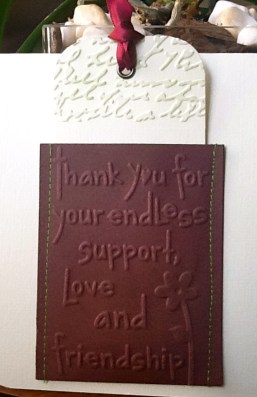 This card is only embossed on the inside I embossed the sentiment with my big shot and made a little pocket which i sewed into the card. Made a little tag which I only half embossed  leaving the rest blank for a handwritten message and used a little DI ink to lightly highlight the text.