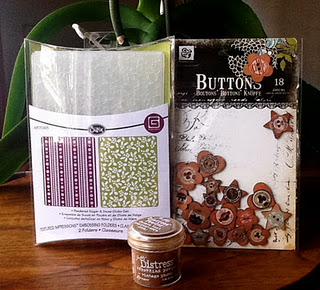 the winner of my challenge will win a set of Sizzix embossing folders some Ranger Distress embossing Powder in Antique Photo and some Prima retro buttons.