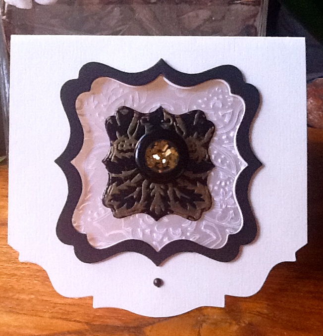 This next card has to be one of my favorites . Using one of my Tim Holtz on the edge dies I cut my card base , I then used Spellbinders nested dies to cut out the three corresponding shapes , the black border is cut out of foam rubber although you would never know looking at the photo !  The aperture window is cut from vellum and the black central piece from very heavy card and both embossed with the same folder. I  heat embossed the centre using Hero Arts gold embossing powder and set with my heat gun. It was covered with glossy accents which gave it that lovely shiny effect and as it was drying added the black and gold button which matched perfectly.