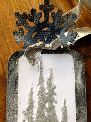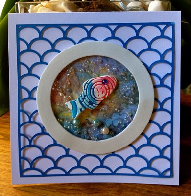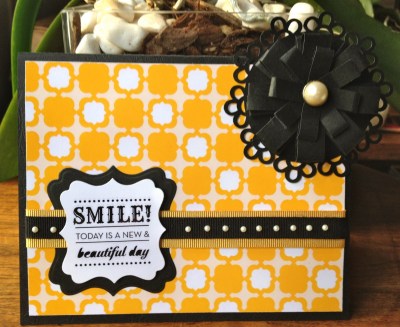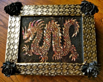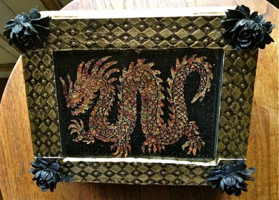 Well this I suppose could be construed as ” Asian ” but I’m asking you all to use every ounce your your imagination and move it on over to the Medieval category ! It looks like a card but it is in fact a box with a glass top which was a real so and so to photo. This was the only shot I could get that didn’t have my gorgeousness reflected in it ! For the base I used magic gold card ( well that’s what it called its self on the package ) I stamped the card with my favourite SU text stamp and then embossed with clear embossing powder, such a waste as you cant see it ! I then inked up my Harlequin embossing folder ( that’s the medieval part ) with black Stazon ink and passed it through the Big Shot. For the dragon I used for the first time this Dreamweaver stencil and coloured it using gilding flakes………never again, I thought glitter was bad this is far worse it actually floats !!! normal breathing just transfers these little flakes to the other side of the room so I had to hold my breath while I was making this portion of the card . The background is filled in with black glitter and the overall image is KITSCH AS CAN BE !!!!!. the black porcelain flowers just arrived yesterday all the way from Hong Kong !! and add to the overall kitschyness of the box. One thing is for sure I will never, ever be using gilding flakes in the near future, that coupled with glitter makes for one big mess , two blingy mutts and one cranky crafter. It also took me three attempts to make the image so there is an abundance of the stuff still hiding in all manner of crevices in the crafting cave !