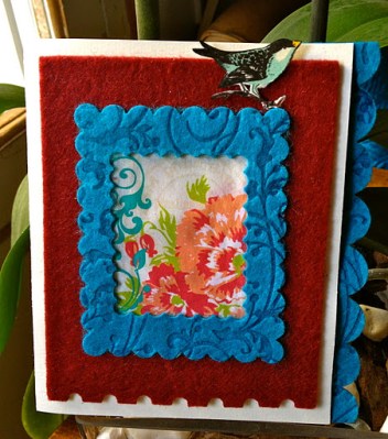 Here I have printed a floral image from my Silhouette onto silk fabric. For the rest of my card I have used felt, the frame was cut using one of my spellbinders dies and the border with Sizziz floral and scallop die. I double embossed them both with another favourite sizzzix embossing folder using SU Rich Razzlebury ink which just about shows up on the photo ! My little birdie from Silhouette also printed onto silk and sits  atop the frame it has been a while since he made an appearance and has been begging to get back into the lime light !