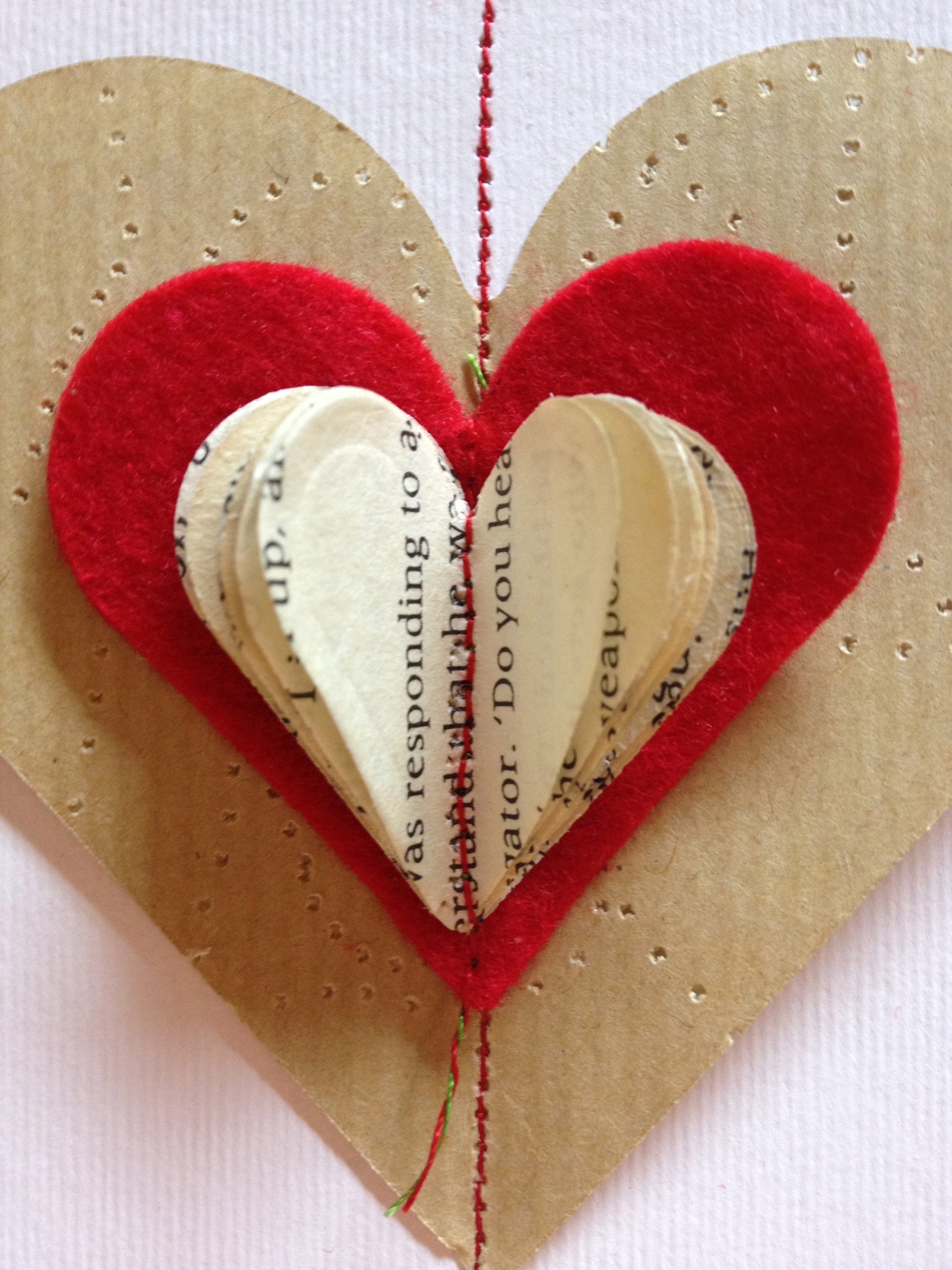 I cut some hearts in various sizes with my spellbinders using pages from an old book, the one piece of ” found ” Kraft paper and some red felt.
