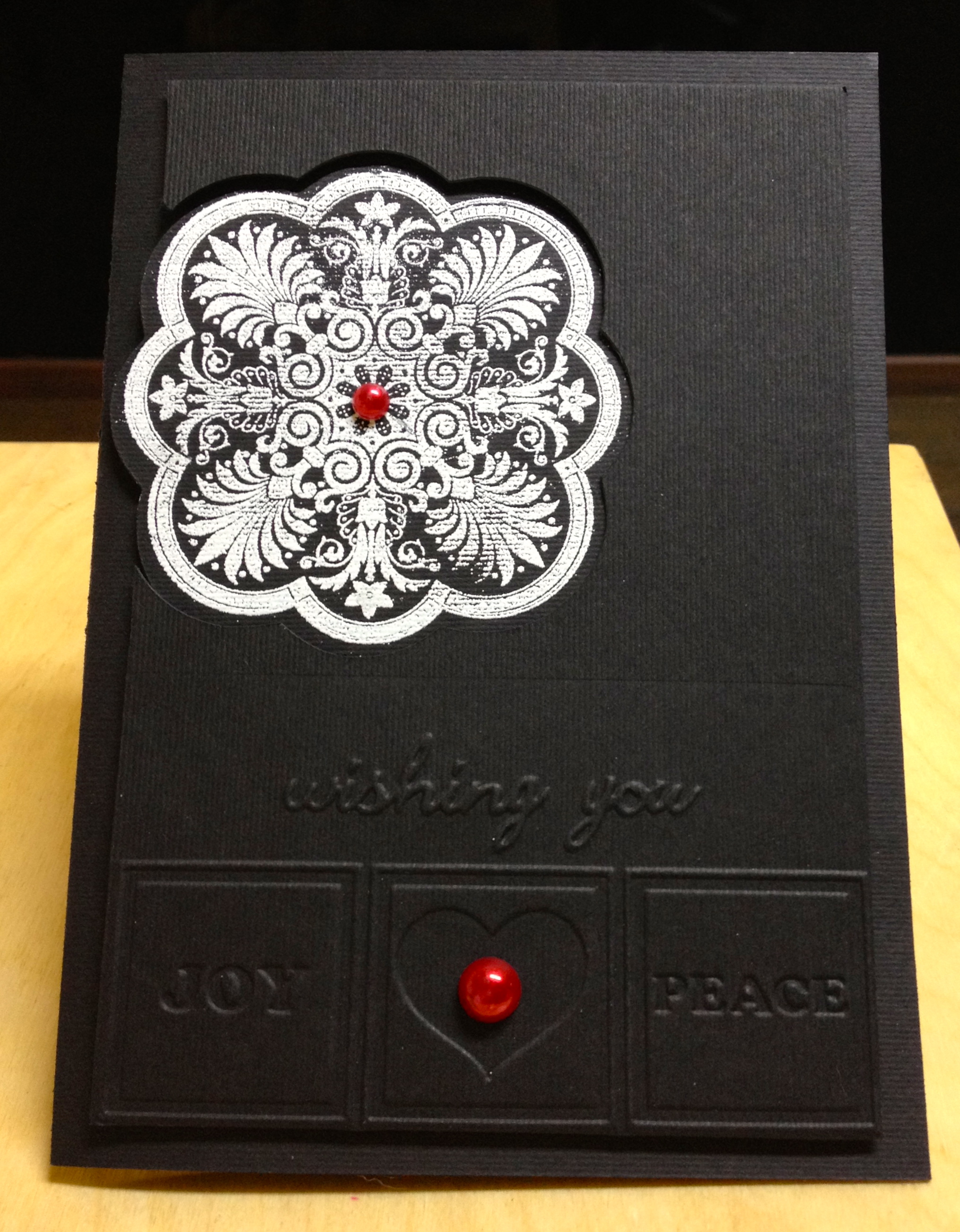 Your card is gorgeous! I love the pop of white against your black card. Beautifully stamped and embossed doily, and I love your dry embossing, too. Such a unique layout.