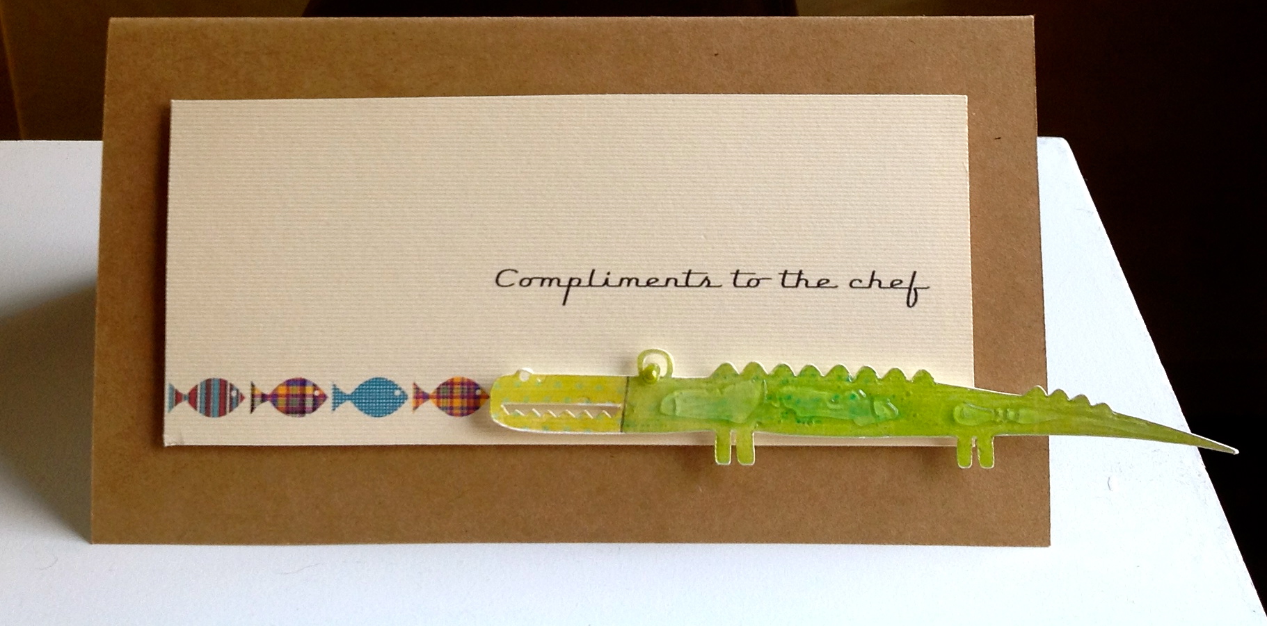 Well, well, Mrs P, how’s your little vacation going. Dare I ask how many empty bottles Florence now has in her recycling bin! Hope you’re going to post some pics of your wild antics! Lovely cards btw, love those little fishes Mr Croc is about to snaffle! Xx