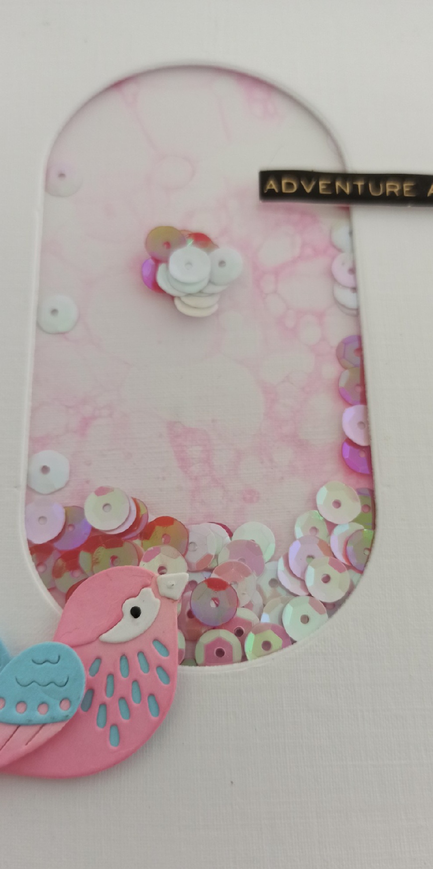 I used this lovely ovalish die for my aperture I still haven’t found out who it belongs to, I really must be more careful with the packaging! The little birdie is from Spellbinders I think it’s called little chickadee. For the background, I used the bubble technique that I saw Chris Stokes using so much fun. I added Stamping Up Melon Mambo ink to a cup of water a few drops of washing up liquid and using a metal straw made lots of bubbles then swooshed (technical term) my paper gently across the bubbles let it dry and Ta-dah a bubbly background is born. I made it into a shaker just to add a touch of colour and a sticker sentiment from Mr Holtz.