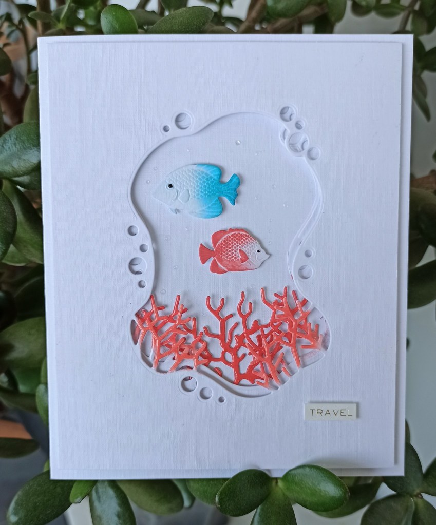 For my card, I used a couple of memory box dies called Under the Sea. I love this set as the fishes are cut and embossed giving lovely texture and just a little colour brings them to life. I used Distress oxides on the fish and coral and a touch of glossy accents to bring the coral to life. Clear Nuovo drops have been discreetly added to the background, so discreetly that you can hardly see them (which was what I was aiming for )