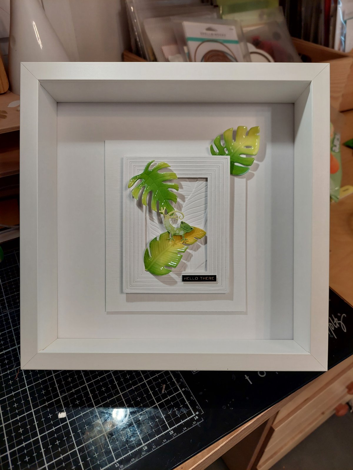 I used a fabulous embossing folder by Altenew but kept it plain as I wanted the colours to really pop on the leaves and the Whittle Lizard. I’m not sure who makes the outer frame as once again I was remiss and chucked out the packaging. When I bought it I thought that all of the frames were attached but it turns out it cuts tiny weeny skinny frames which for me and my sausage fingers are difficult to handle. I tried to keep them all attached on this card with the help of lots of tape and glue although I did lose a few of the little tykes along the way.