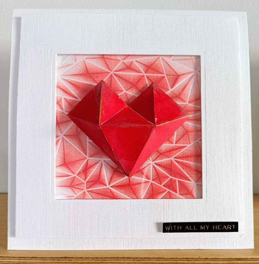 I made a frame using some old Spellbinders dies and embossed a piece of card with this fantastic EF from WeRmemory keepers. I brushed carefully over the top with Distress Oxide in Coral Red so as to keep some of the white card visible. I then attached acetate as I was planning to make a shaker but as it happens I didn’t like the result so left it as was. The faceted heart is courtesy of Mr Holtz and Sizzix also colored by Distress Oxide and a tad of clear Distress embossing glaze for a little shine.
