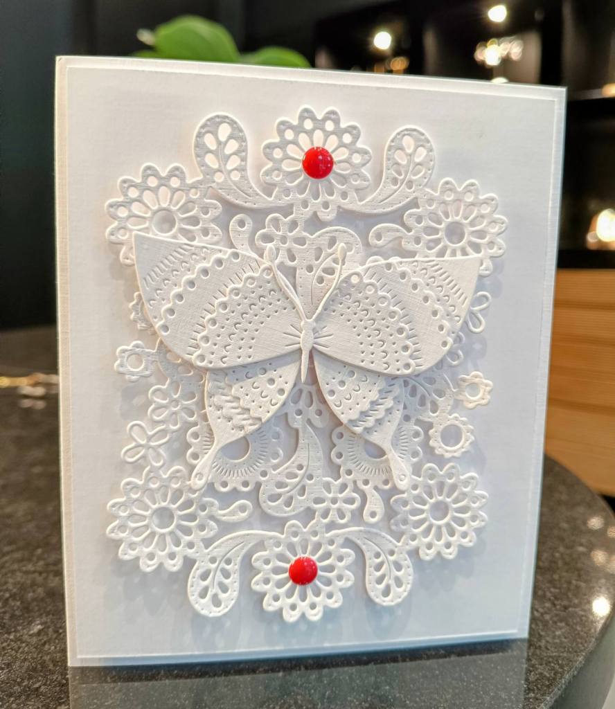 For my first card, I used my brand new Silhouette Cameo 5 to cut out the sweet couple and used Poppy Stamps Nordic Flourish Background behind them.I also used the same background for my second card together with another Poppy Stamps Nordic die in butterfly form, all popped up with a touch of foam for dimension. A few enamel dots strategically placed and other you have it! Did you guess which country’s flag inspired me? Japan !!! I’ve always wanted to visit and maybe this year will be the year !!! fingers crossed.
