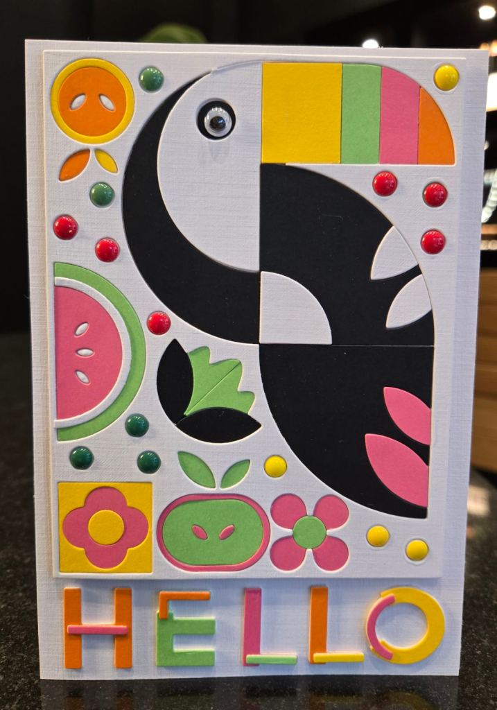 I used another couple of fabulous die sets from A Pocket Full of Happiness this gorgeous Tucan and a fantastic modern alpha set. I won’t bore you with the details of how I made it as it looks perfectly obvious,lots of die cutting tons of paper piecing a huge mess on my desk,floor and the dog !
