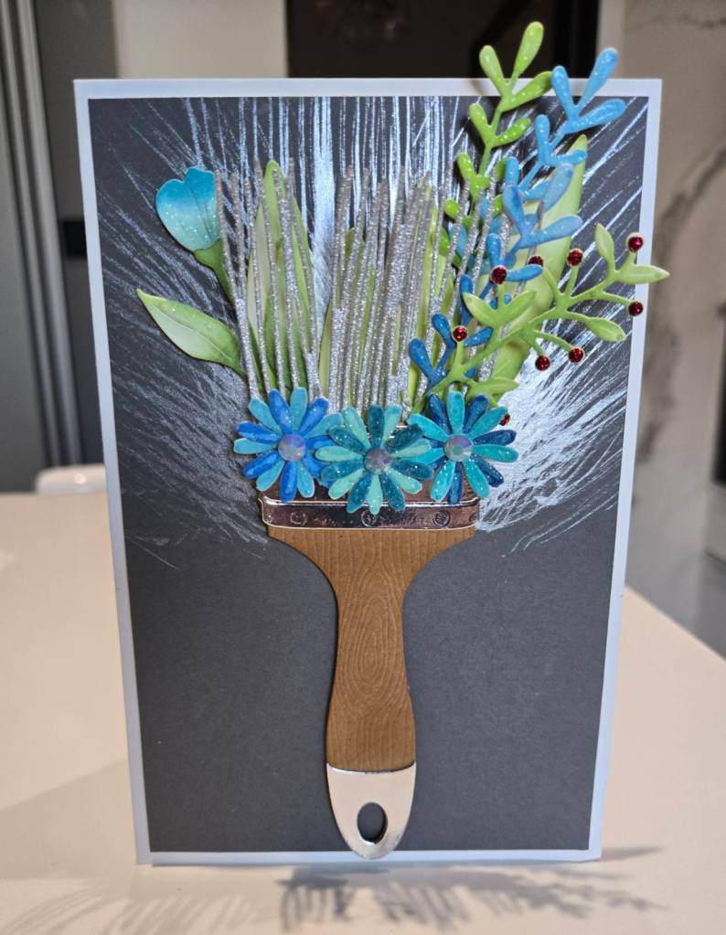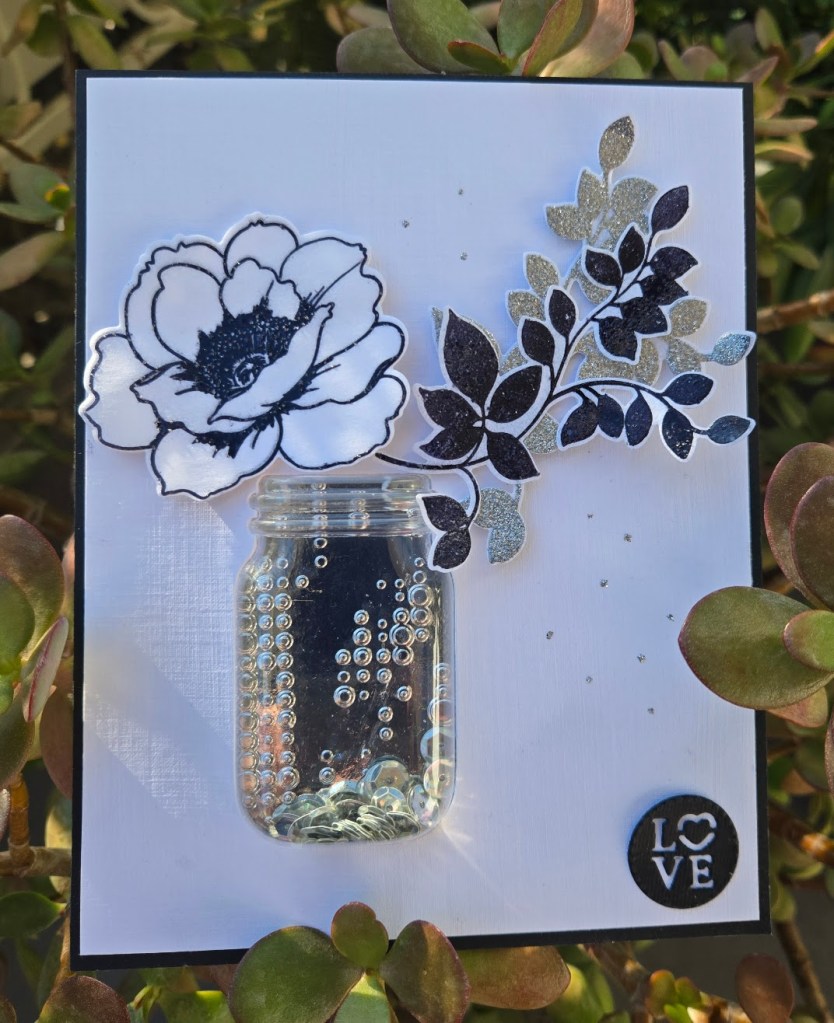 I used the Altenew Wallpaper Art Stamp and die to create the florals stamped in black archival ink once onto card and then a second time onto velum die cut with matching dies which were placed on top of the card, I know you can’t see it but it’s there . Some of the leaves were cut from glitter card and others were stamped. I added a touch of glitter to the center of the flower and for extra sparkle I got out my silver stickles to add a little touch of sparkle hither and thither. The blooms were placed inside my Sizzix mason jar with some embossed mirror card and a few sequins.