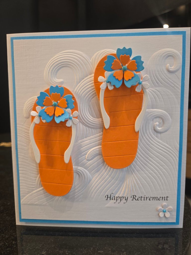 I used this fantastic flip-flop die by A Pocket Full of Happiness with lots of layers of card and foam to make it more sturdy. The Mighty Waves embossing folder by Altenew for the background, and the sentiment was computer-generated. This was actually an order for a customer who loves the sea, so two birds were killed with one stone. Actually, no birds were injured in the making of this card.