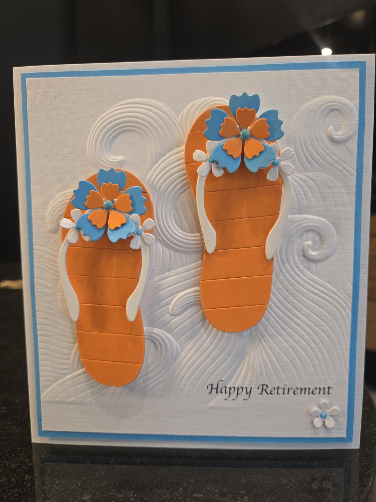 I used this fantastic flip-flop die by A Pocket Full of Happiness with lots of layers of card and foam to make it more sturdy. The Mighty Waves embossing folder by Altenew for the background, and the sentiment was computer-generated. This was actually an order for a customer who loves the sea, so two birds were killed with one stone. Actually, no birds were injured in the making of this card.