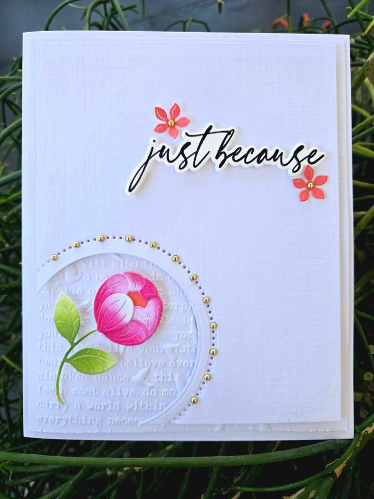 The floral die, embossing folder, and dotted circle are from Spellbinders. In fact, the dotted circle is a glimmer plate, which I used as a die. Once again, the “gold blobs” are courtesy of Pinkfresh Studio, and the sentiment is Altenew.