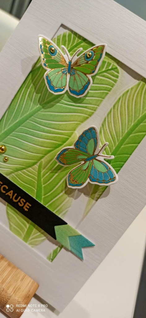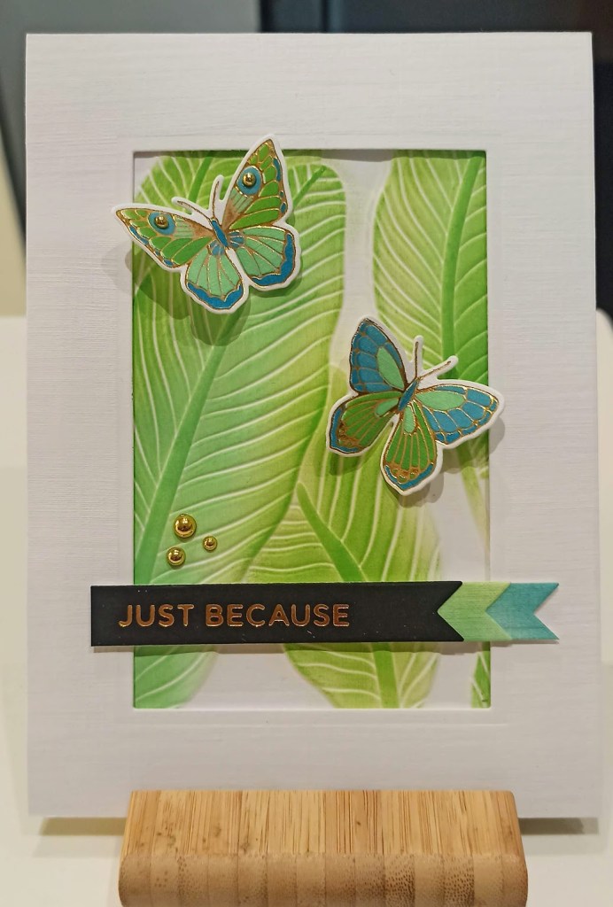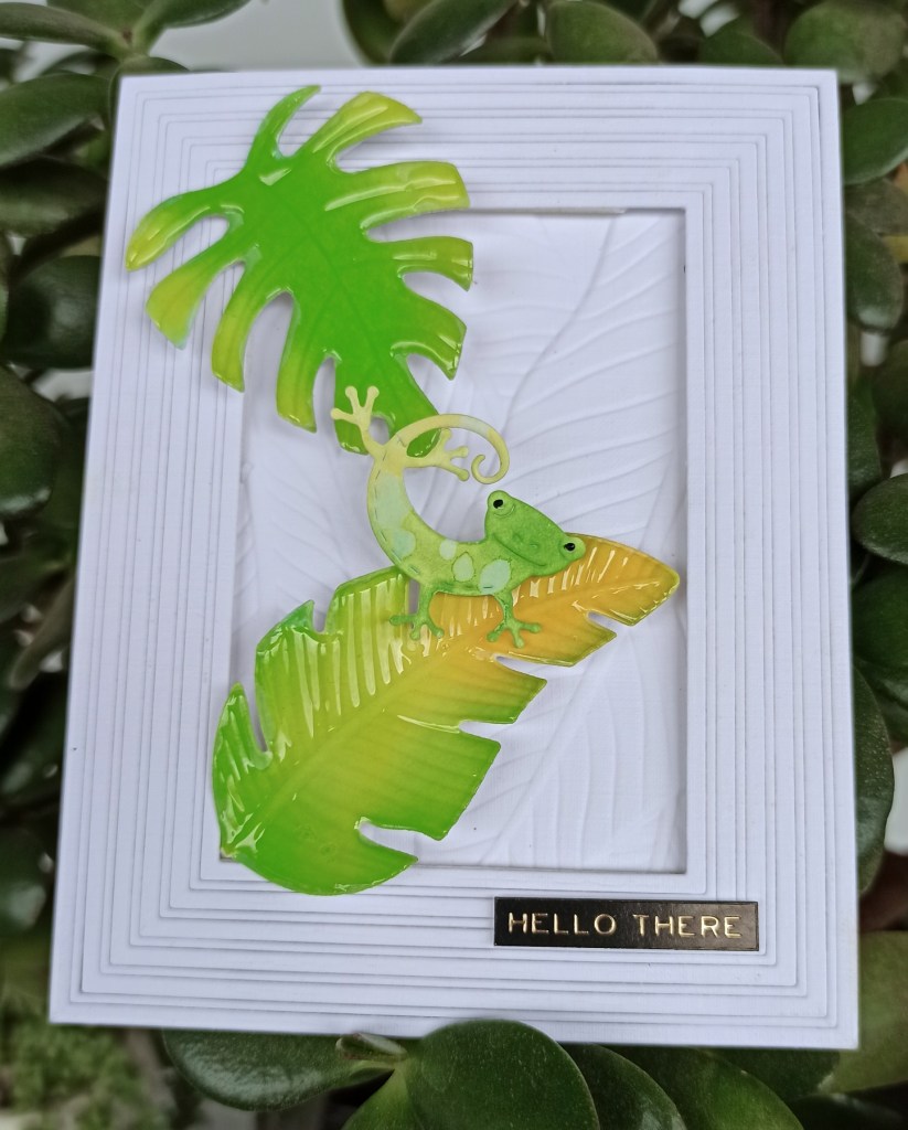 I used a fabulous embossing folder by Altenew but kept it plain as I wanted the colours to really pop on the leaves and the Whittle Lizard. I’m not sure who makes the outer frame as once again I was remiss and chucked out the packaging. When I bought it I thought that all of the frames were attached but it turns out it cuts tiny weeny skinny frames which for me and my sausage fingers are difficult to handle. I tried to keep them all attached on this card with the help of lots of tape and glue although I did lose a few of the little tykes along the way.