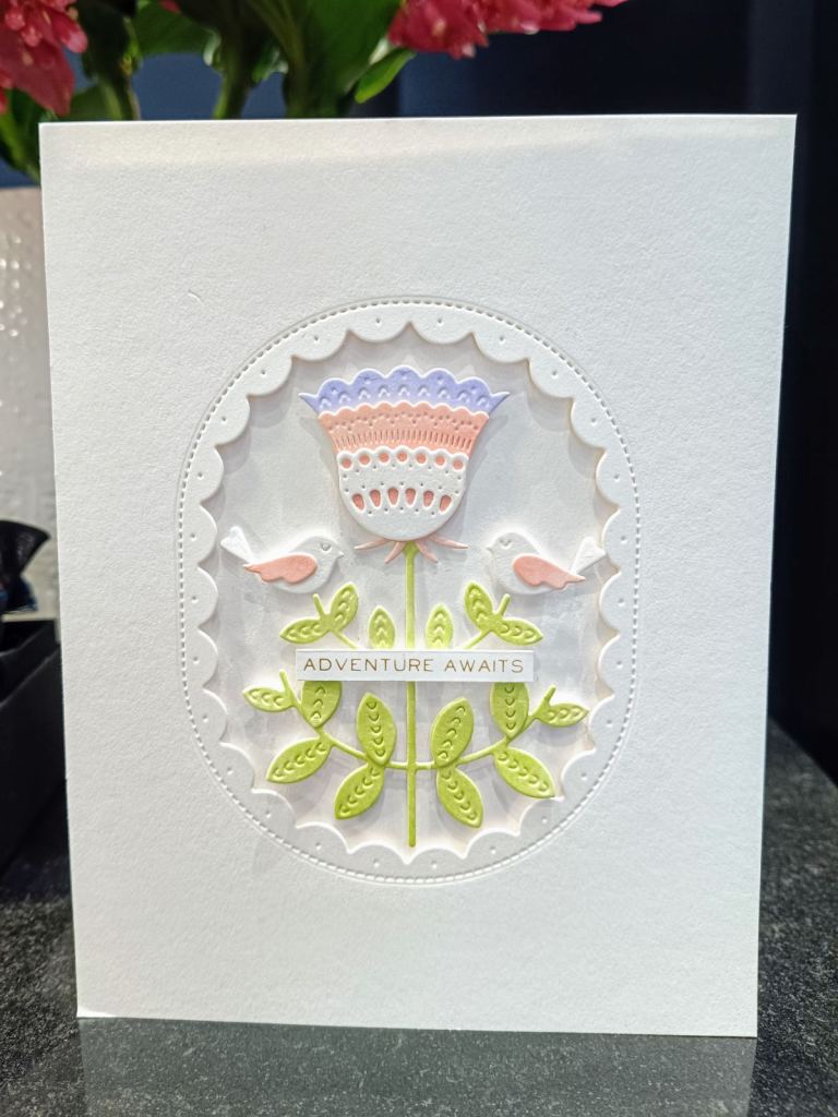 This card came together really quickly using this gorgeous Spellbinders die set Towering Blooms,coloured with Distress Oxides in Squeezed Lemon, Wilted Violet, and Seedless Preserves, mounted with a lashing of foam tape onto a white card base As I said, it came together really quickly, and boy did it need to, as I’ve been working 12-hour days for three weeks nonstop. I do believe the crafting gods were looking down on me.